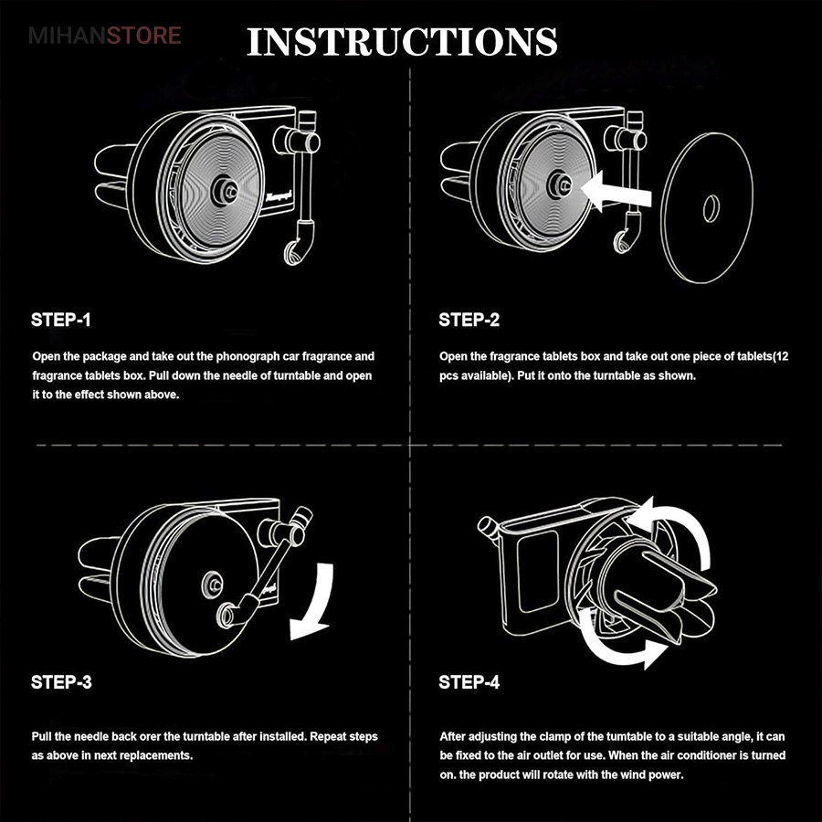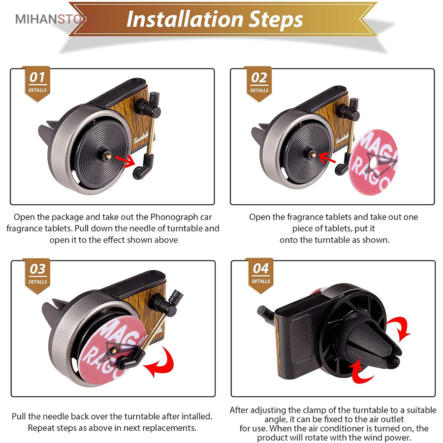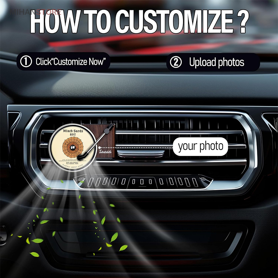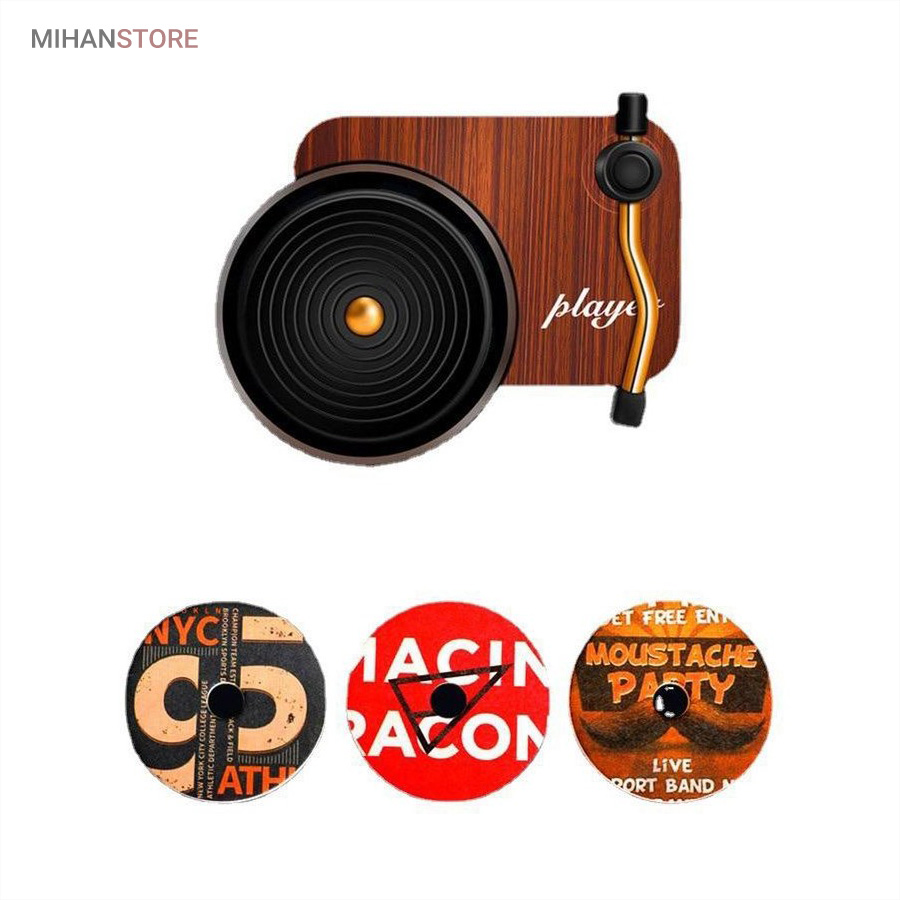 خوشبو کننده داخل خودرو یکی از وسیله های مورد نیاز داخل خودرو است که هم باعث تغییر بوی داخل خودرو میشود هم باعث زیبا تر شدن فضای داخلی خودرو میشود اگر این محصول تزیینی باشد . این محصول در دریچه کولر خودرو نصب میشود و طرح گرامافون دارد که حس نوستالژیکی به داخل خودرو میدهد . با ورود باد کولر یا بخاری به این محصول صفحه روی آن شروع به چرخش میکند همانند یک گرامافون قدیمی . داخل بسته بندی محصول قرص خوشبو کننده قرار دارد که روی صفحه مشکی وسط قرار میگیرد . بعد از اتمام پخش بوی آن میتوایند از هر عطر و ادکلنی که مورد پسند شما است روی آن اسپری کرده و مجدد استفاده کنید .