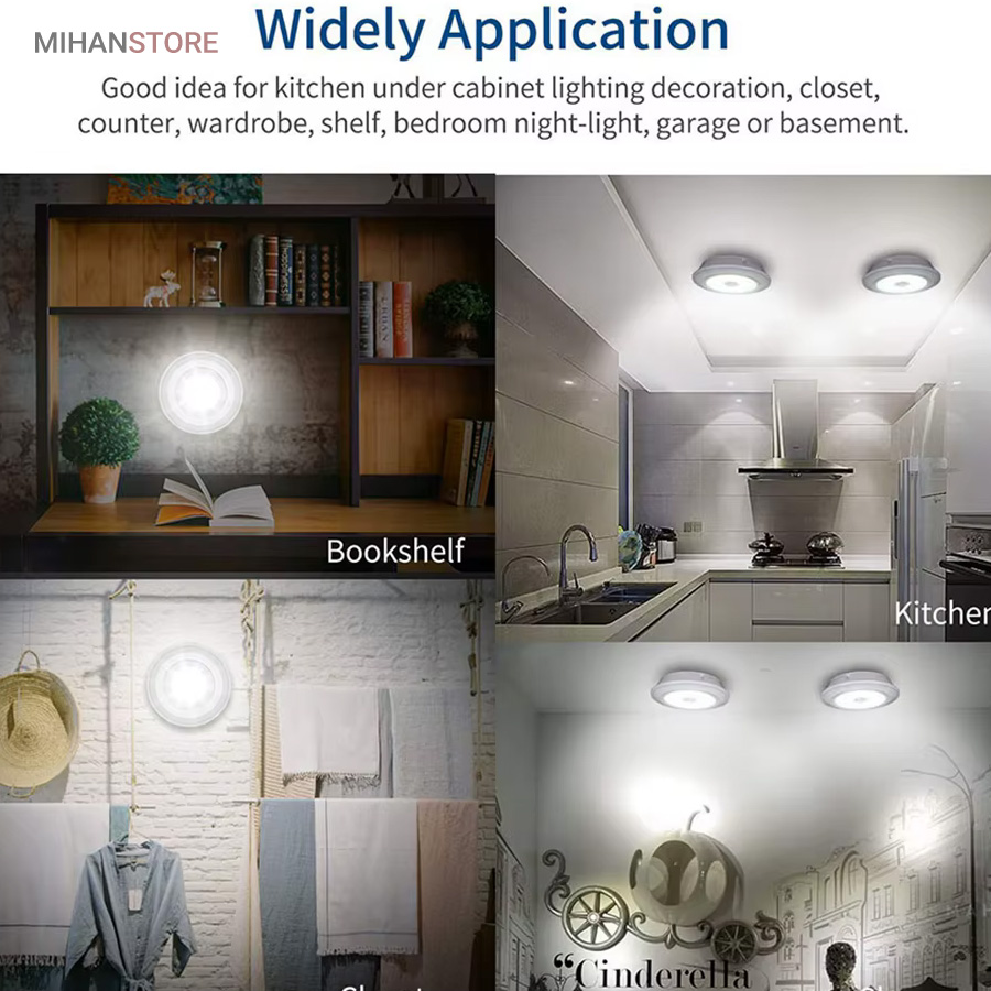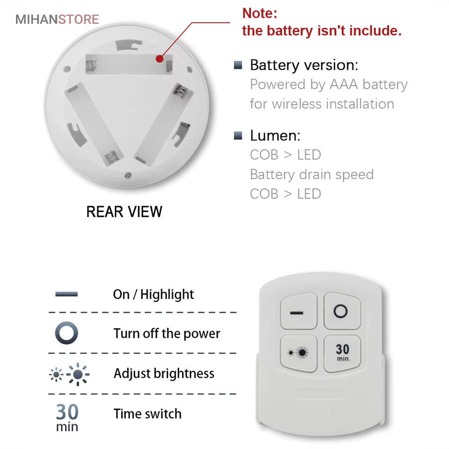 چراغ‌ها با استفاده از کنترل از راه دور با برد ۵ تا ۱۰ متر یا به صورت دستی از طریق فشردن قسمت مرکزی هر چراغ روشن و خاموش می‌شوند. در نتیجه حتی اگر چراغ در مکان مرتفع یا دور از دسترس نصب شده باشد به‌راحتی می‌توان از راه دور آن را کنترل کرد. طراحی بدون سیم باعث شده است که این چراغ‌ها برای نصب در هر مکانی مناسب باشند. نیازی به هیچ‌گونه سیم‌کشی یا اتصال برق نیست؛ تنها کافی‌ست ۳ عدد باتری AAA (برای هر چراغ) تهیه کنید و آن را در جای دلخواه بچسبانید.